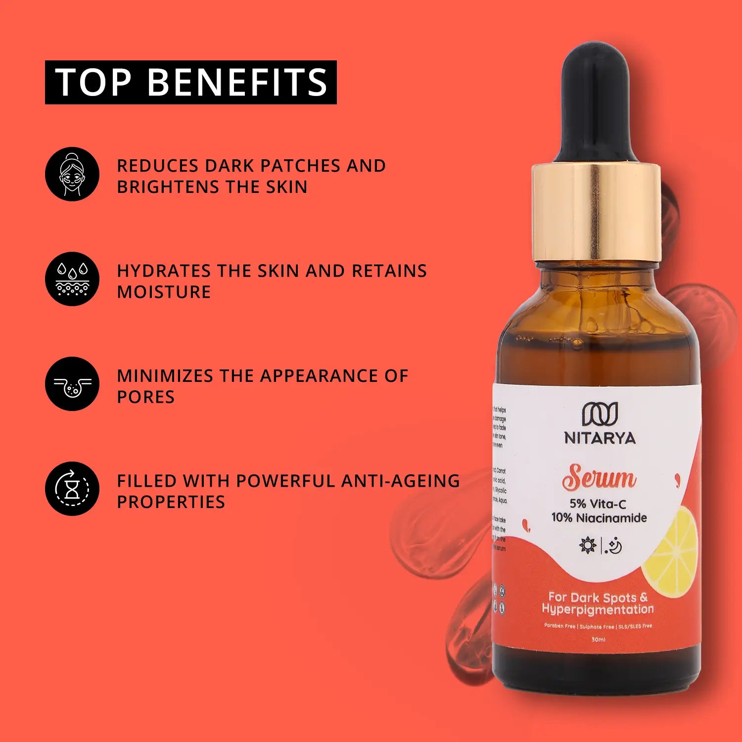 Nitarya 5% Vita-C Face Serum for Glowing Skin | Vitamin C | With 10% Niacinamide and Hyaluronic Acid | Removes Dark Spots | Helps with Hyperpigmentation and Uneven Skin Tone | 30 ml